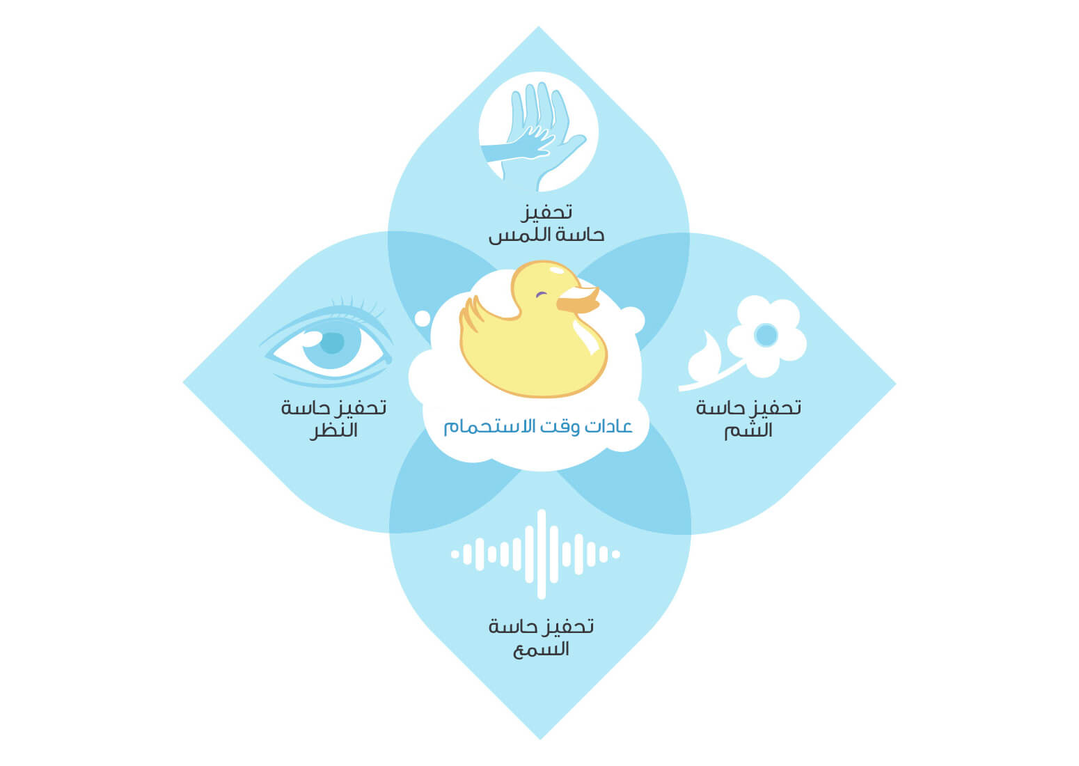 يوفر روتين وقت الاستحمام فرصة تحفيز حواس الطفل المتعددة من خلال التلامس الجسدي، كأن يلمس الطفل أيدي والدته وهي تُدلكه؛10 وعن طريق التواصل البصري المباشر؛ 10،14 وسماع أصوات والديه17؛ وتمييز الروائح المألوفة، كرائحة الأب أو الأم21، أو رائحة المنتجات المستخدمة في تحميم الطفل.10 إن تعريض الأطفال بشكل أولي ومستمر لهذه الأنسجة والمشاهد والأصوات والروائح أثناء استحمامهم يوفر فرصاً ثرية فريدة لتحفيز حواسهم المتعددة سواء حاسة اللمس أو الشم أو البصر أو السمع.